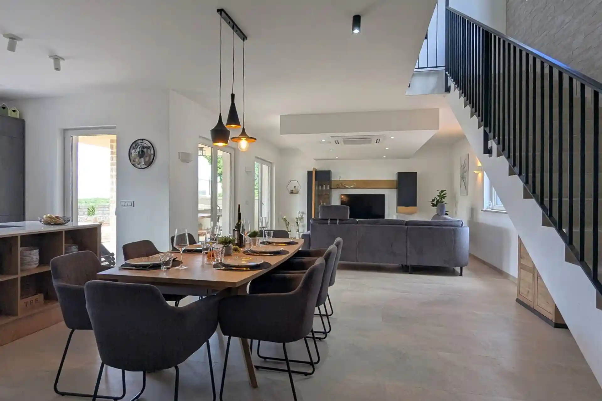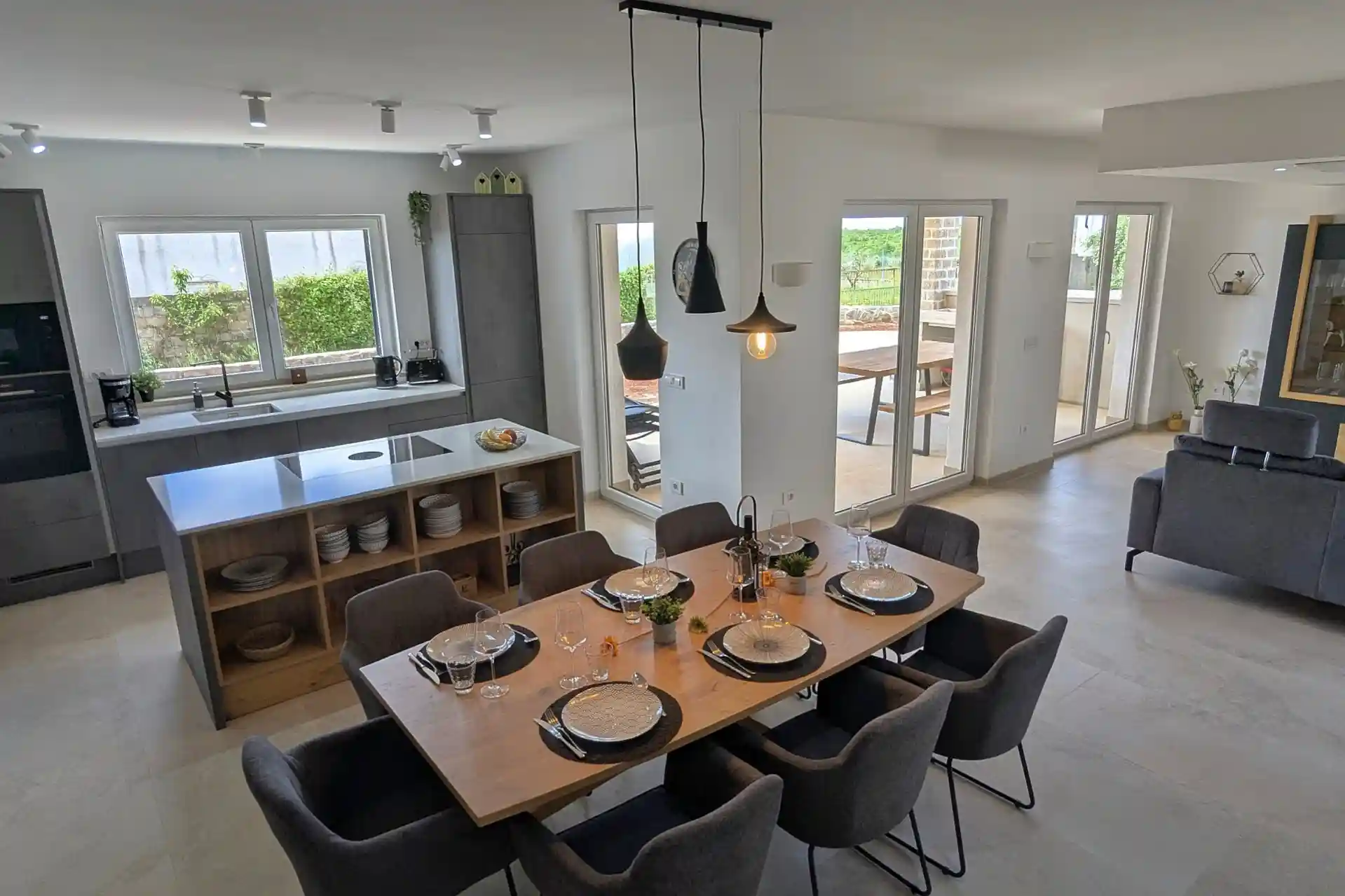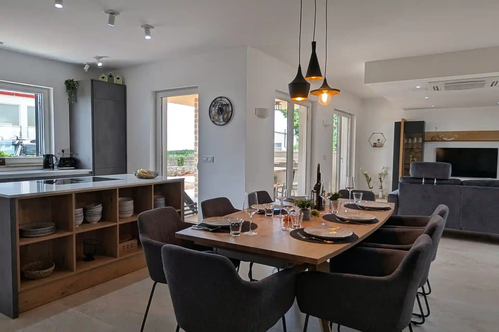 Im Erdgeschoss befindet sich ein großer Wohn-Essbereich mit offener Küche und direktem Zugang zu Terrasse und Pool. Die Küche verfügt über Geschirrspüler, Kühl-Gefrierkombination, Cerankochfeld, Microwelle, Toaster, Filterkaffeemaschine etc.
