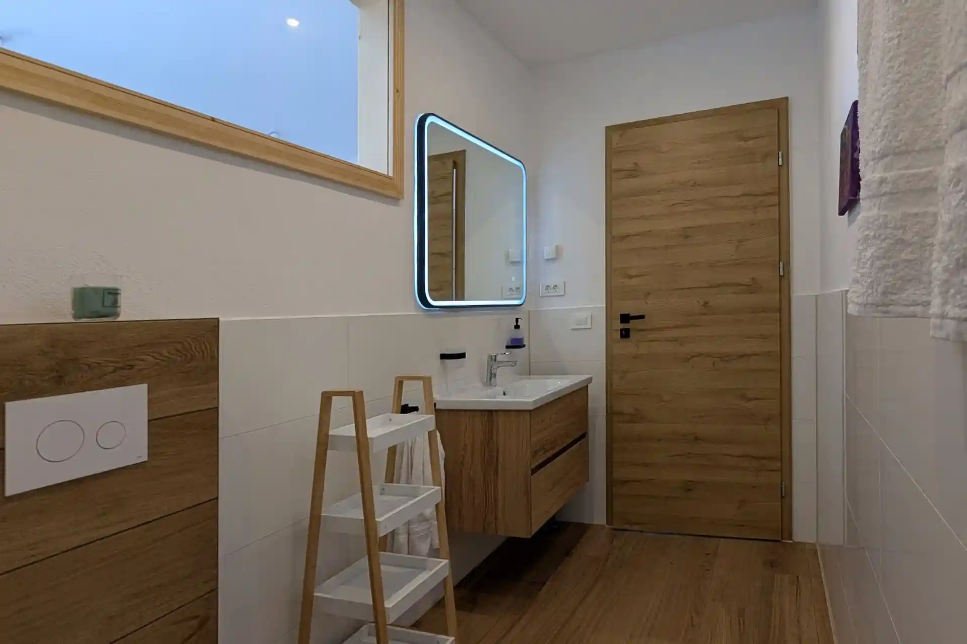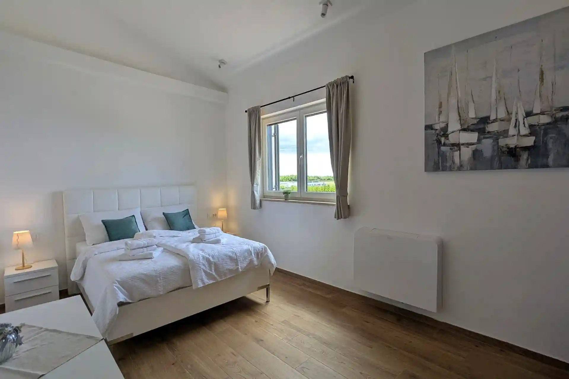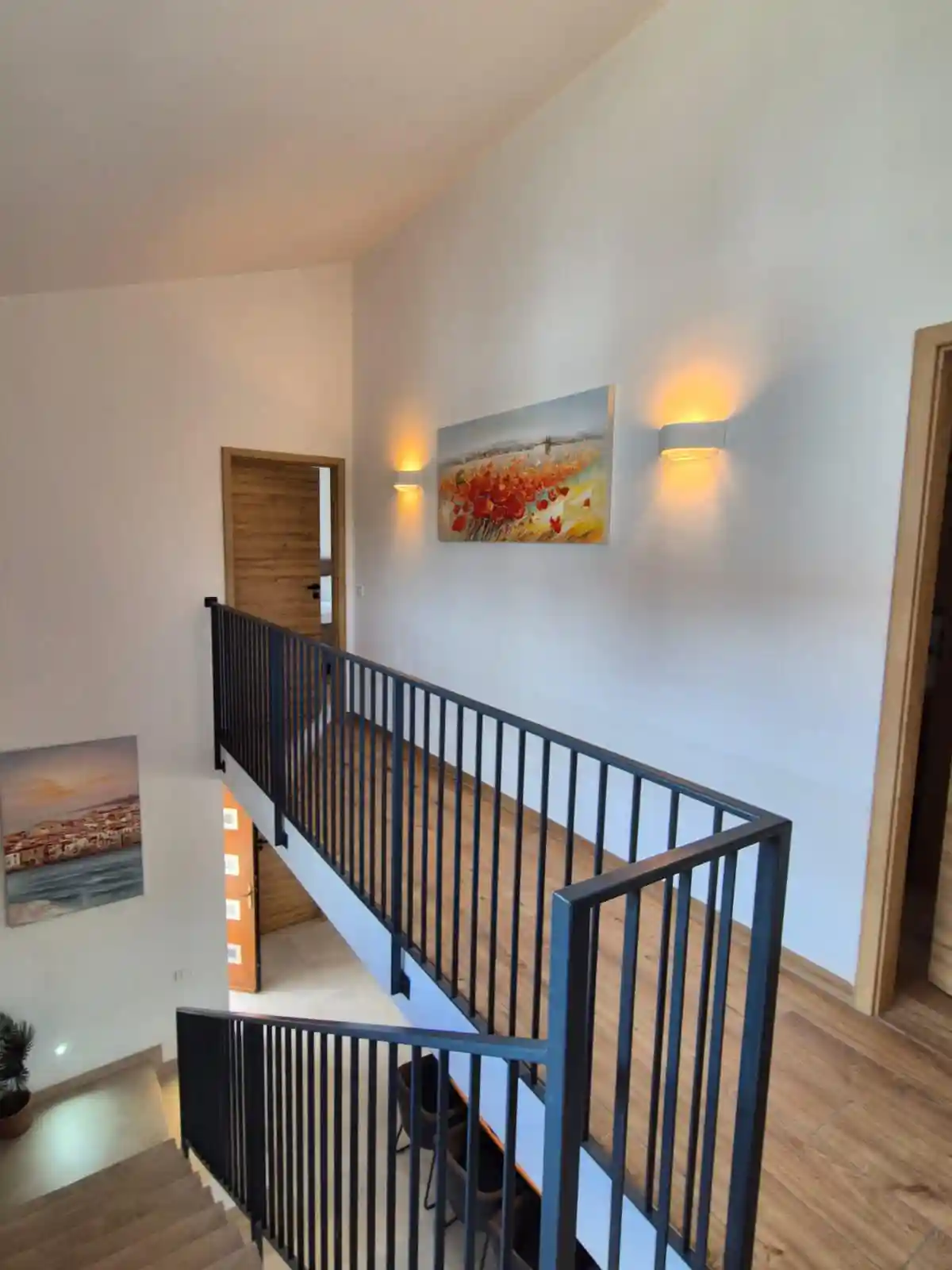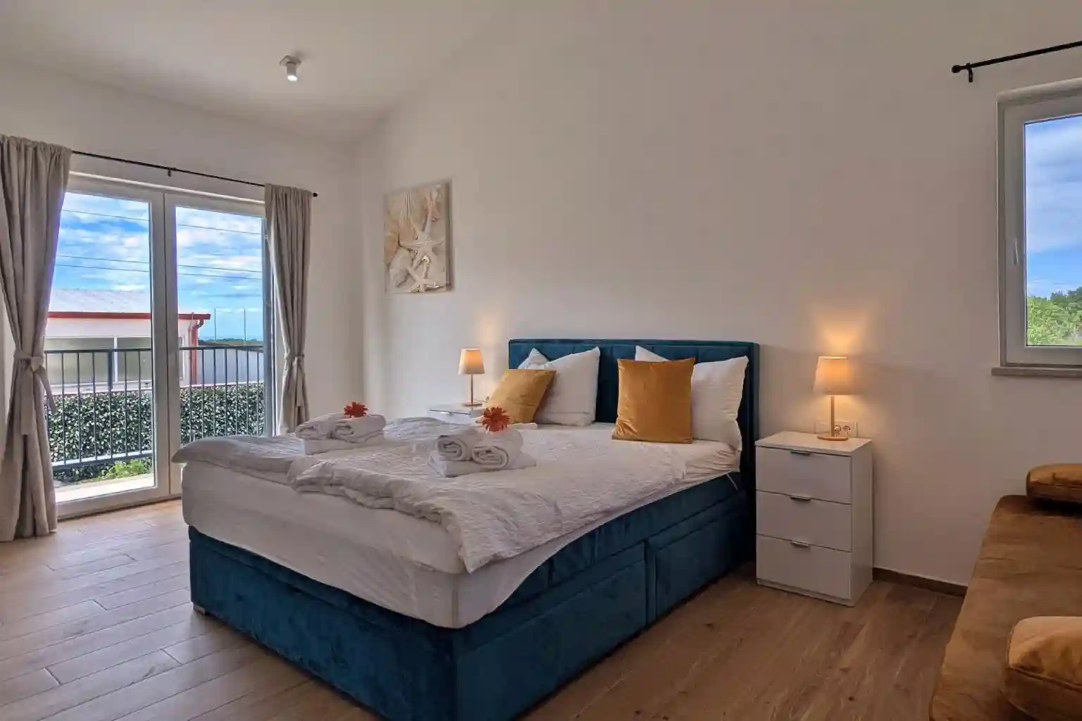 Im Obergeschoß befinden sich die Schlafzimmer, welche mit Boxspringbetten (1,60/1,80×2,00m), Ausziehcouchen (Matratzenauflage 1,60×2,00m) ausgestattet sind. Sie sind klimatisiert und verfügen über Fliegengitter an Fenster und Balkontüren. Alle Bäder sind mit Fön ausgestattet.